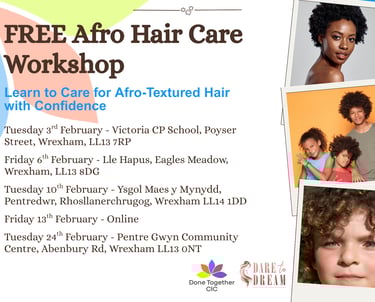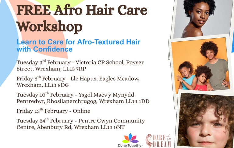 Done Together CIC is proud to announce that we’ve been awarded just over £4,200 to deliver Wrexham’s first-ever Afro hair education workshops.